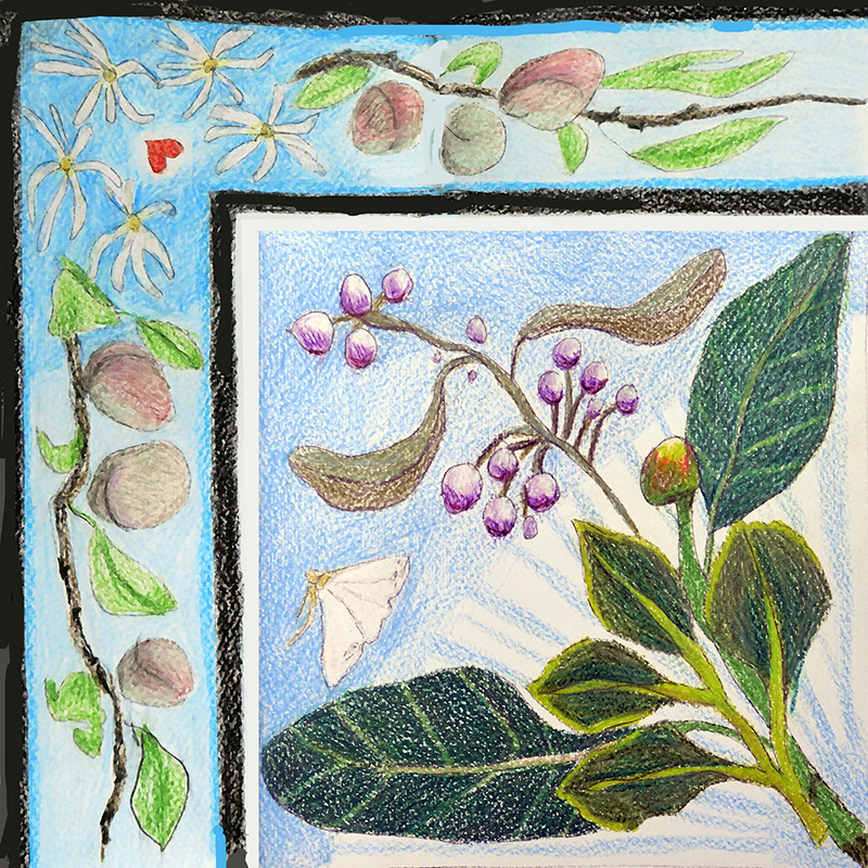I continue to be interested in using tinted hues that blend with natural eye and hair colouring, as a way for my garments to harmonize with the wearer. Asymmetry is welcomed. Wilder designs are presented alongside more delicate traditional placements. Sometimes, two of the long sides of scarves do not match…perhaps this mirrors how life, itself, is. I utilize my own hand-painted, marbled, or paste paper resources to create collages. Any imperfect edges, wobbly shapes and imprecise dimensions, are a sign that the human hand has formulated these designs. My appreciation of vintage style is seen through the use of muted palettes and classical shape placements. My blog on Medium shares ways to explore backyard plants for inclusion onto scarves…it facilitates ways in which interested artists can make their own designs for print-on-demand. The link to blog No. 4.64 Trying to Convince shares a scarf inspired by a usually unseen backyard.