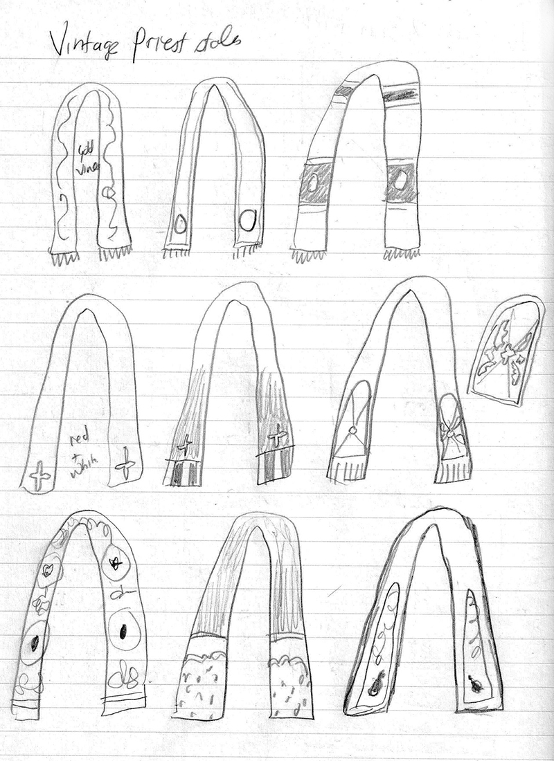 When you search for images of antique priest stoles, you can find scarf-like garments where intricate borders, fringed edgings, carefully planned vignettes, and particular ‘badges’ are fashioned onto the strips of often gently textured cloth. Teams of women, called borderers, are still stationed at cathedrals for such creative tasks as designing, manufacturing or repairing such garments. These antique stole placements inspired my choices to also make representations of plants, animals, or birds, for instance, at the ends of long scarves. Other scarves were kept as square cloths with borders.