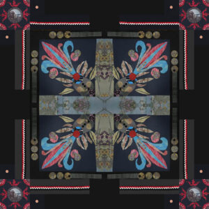 Carlotta is a vibrant print, bursting with life and colour inspired by neighbourhood gardens and sidewalk foliage in a striking palette of lilacs, midnight blues and chartreuse greens. The pink flower is approximately 3.5cm. The largest leaf is aroun