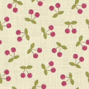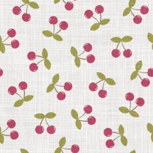 Clean and crisp, this version offers a fresh, modern take on vintage fruit motifs. The subtle linen texture adds depth while keeping the palette light—ideal for cheerful kitchen décor, baby accessories, and breezy summer garments. Cherry motifs are approximately 2.5cm…