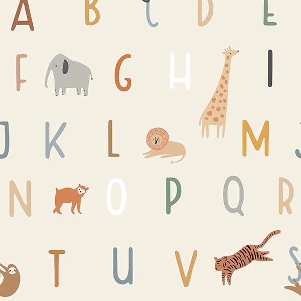 An ABC design illustrated in earthy tones, featuring jungle animals drawn in a playful doodle style. The letters measure approximately 5 cm in height