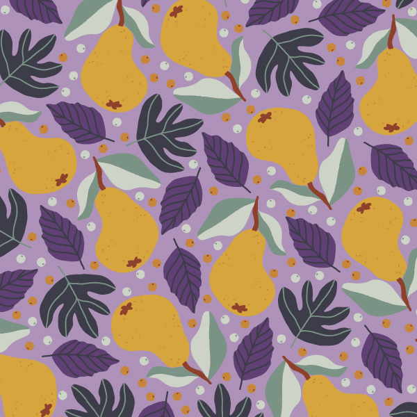 Juicy pears, leaves and berries in a rich colour palette featuring pops of plum, lavender and sage. The leaves and pears are sized between approximately 2 to 3 inches.