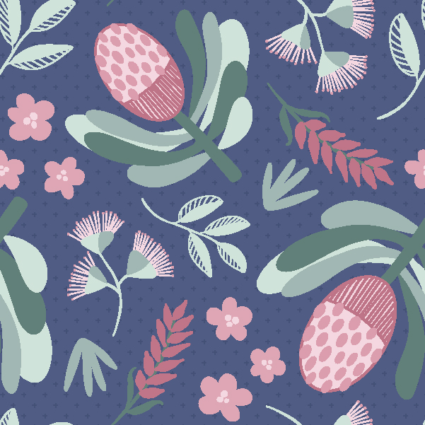 “Banksia Blossom” is multidirectional pattern inspired by Australian native blooms in softer colours of blush and rose with a mix of green foliages, laid on a background of muted blue.