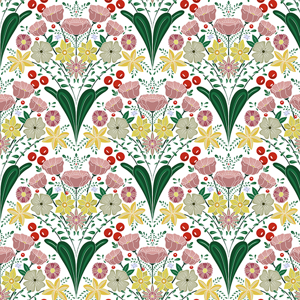 A garden bouquet of roses, daffodils, berries and other blooms. Featuring shades of Light and Medium Yellow, Light Pink, Dusty Pink, Red, Green and Maroon.