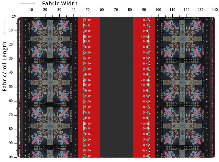 Scarf panel measures 31 × 140 cm. You can fit 3 full scarf panels within 1 metre of fabric.