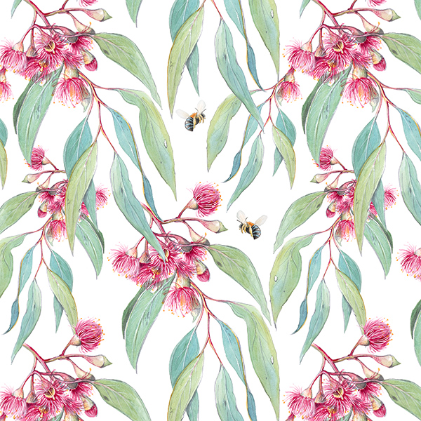 A delicate and sweet garden-inspired watercolour design with pink flowering gum blossoms, and native Blue-Banded Bees busily buzzing. Simple and elegant, staright from the sketchbook by Nadya Neklioudova. Scale: each leaf is about 10cm long.
