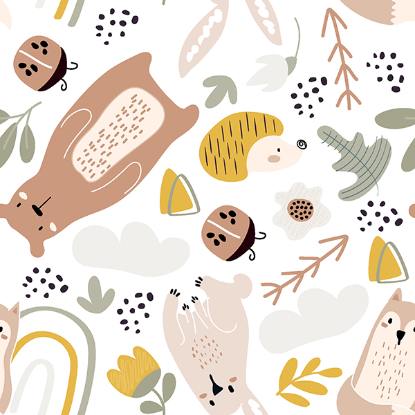A boho-inspired design featuring a bear, a bunny, and a fox, illustrated in a soft neutral palette. The bear measures approximately 5 cm in height.