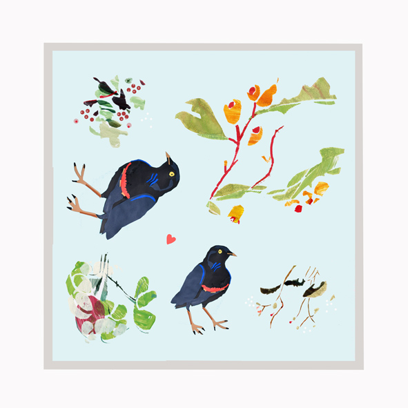 Two birds, grackles, sit within a blossom filled woodland, set against a pale mountain morning light. The two birds were made from collaged, plain-coloured papers, whilst the plants were multiple coloured layers of stencilled images, printed from gelatine plates. The birds look out from their garden in a stance of ownership and acute vigilance. They are not fierce creatures but ones alert for justice, none-the-less.
