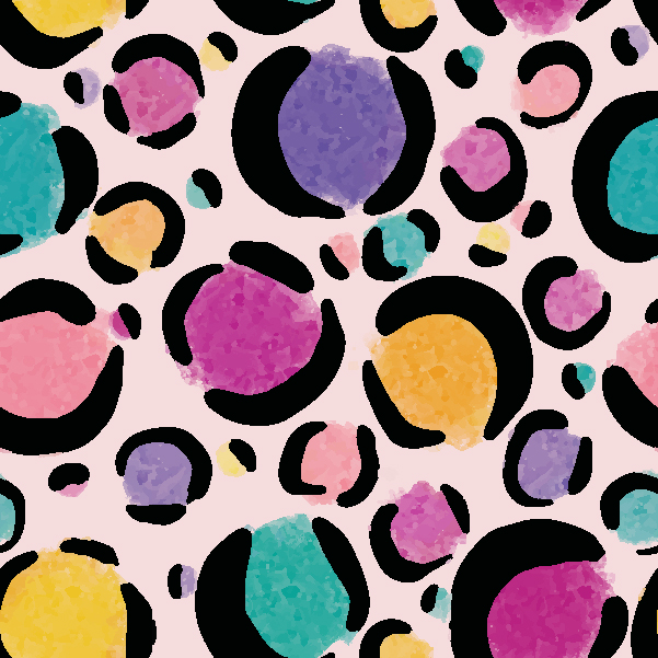 “Lively Leopards” is a fun and bright animal print with splotches of purple, pink, coral, teal and yellow on a light peach background.