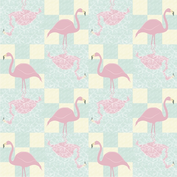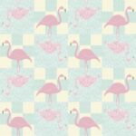 A playful retro-inspired print featuring pink flamingos posed across a mint and yellow checkerboard backdrop, complete with mirrored reflections for added visual charm. This design channels vintage resort vibes and poolside whimsy—perfect for summer apparel, novelty accessories, and tropical-themed décor. Check squares are approximately 2.5cm in width.