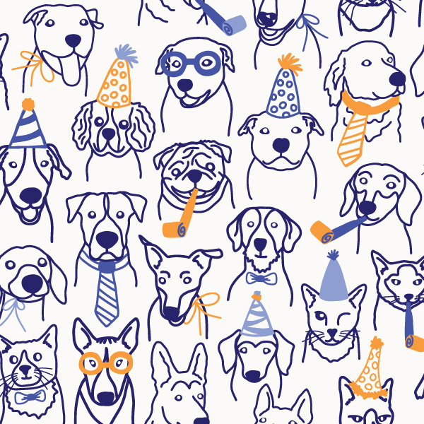 ‘Pawsome’ party vibes with cute cats and dogs wearing fancy hats and glasses. Pets are sized between approximately 2 to 3 inches.
