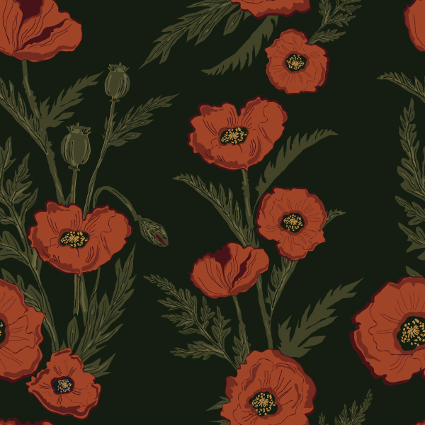 Bright Poppies set against a dark green background ooze both confidence and playfulness. This design will look fantastic on luxury nightwear, swimwear and bed linen adding a sense of thrill and cheerfulness.