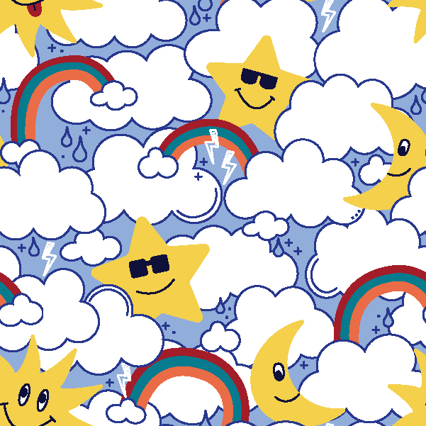 “Summer Days” features our celestial superheroes chilling out amongst the sunshine and clouds with red/teal/orange rainbows scattered around.