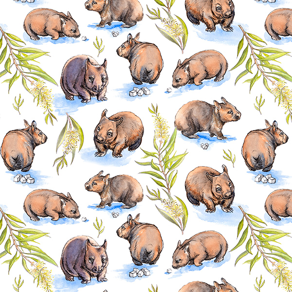 An adorable bunch of whimsical Wombats, wandering around in their little wonderland, leaving behind… err… sugar cubes! (If you know wombats, you know!) Straight from Nadya Neklioudova’s sketchbook, drawn from life – to your home or kids’ room textiles, or your next sewing project. Scale: each wombat is about 6cm tall/wide.